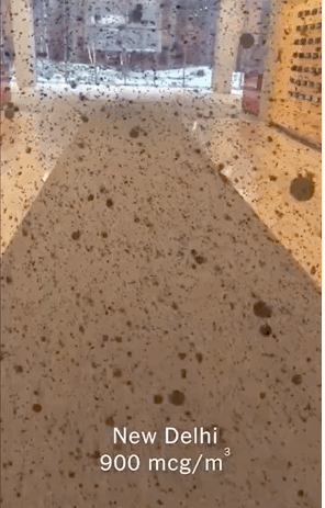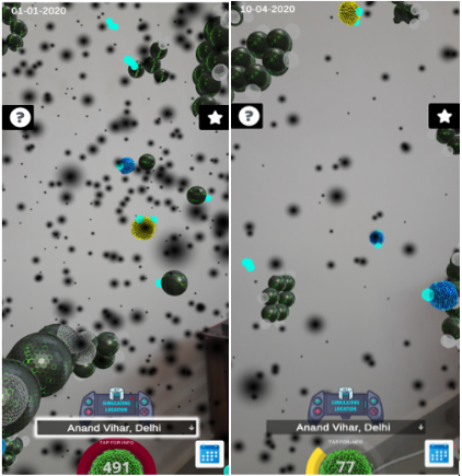 Práve v Indii, ktorá sa dlhodobo borí s problémom extrémne znečisteného ovzdušia, sa v posledných rokoch sústreďuje veľké úsilie a pozornosť na riešenie tejto otázky. Výsledkom snahy indického tímu je aj publikácia výsledkov ich práce z roku 2020, ktorou chceli ukázať, ako by to asi vyzeralo, ak by častice znečisťujúcich látok boli oveľa väčšie a okom viditeľné, samozrejme vo vzťahu k reálne nameraným údajom. Tiež využili možnosť porovnať koncentrácie znečisťujúcich látok v ovzduší pred a počas pandémie koronavírusu. (obr.2)
