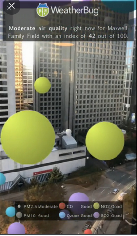 Výhodné a intuitívne spojenie predpovede počasia s informáciami o kvalite ovzdušia ponúka aj aplikácia Weatherbug. Informácie sú dostupné nielen vo forme „klasického“ indexu kvality ovzdušia zohľadňujúceho príspevok rôznych znečisťujúcich látok, ale aj v interaktívnej forme využívajúcej technológiu rozšírenej reality (obr. 3).