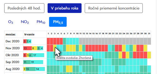 - K podrobným informáciám sú ďalej zahrnuté informácie o kvalite ovzdušia v priebehu roka, pozrite vizuálne zobrazenie. Položením kurzora na jednotlivé bunky sa zobrazuje v bubline legenda.