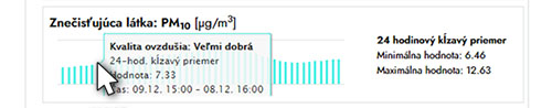 - Podrobné informácie sa týkajú prehľadu úrovni kvality ovzdušia za posledných 48 h od aktuálnej informácie o kvalite ovzdušia pre jednotlivé znečisťujúce látky: PM10, PM2,5, NO2, SO2, a O3, zobrazuje sa aj maximálna a minimálna koncentrácia znečisťujúcej látky.