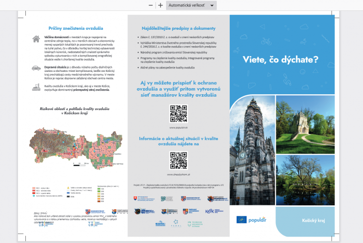 Získajte informácie o tom, ako sa monitoruje a hodnotí kvalita ovzdušia v rámci kraja, v ktorom žijete a akú dosahuje úroveň z pohľadu vzťahu ku zdraviu ako aj stavu ekosystémov. Využite možnosť dozvedieť sa viac o hlavných príčinách, ktoré ju ovplyvňujú, ale aj o tom, ako ju zlepšiť. Tiež o strategických, koncepčných a legislatívnych prístupoch k ochrane ovzdušia a o finančných nástrojoch na podporu realizácie opatrení. Tieto informácie „v kocke“ Vám poskytne séria letákov vydaných v rámci projektových výstupov dostupných na https://www.populair.sk/sk/docs/31.